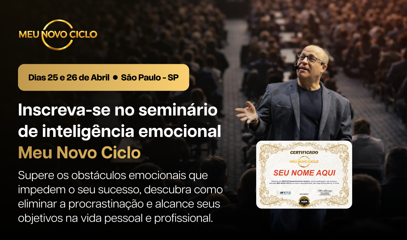 MEU NOVO CICLO é um evento 100% presencial, realizado em São Paulo. A experiência foi desenhada para acontecer ao vivo, sem gravações.